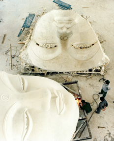 为了充份表现出释迦牟尼佛的庄严德相,和达到完美的艺术造型,专业的技术人员终於克服了技术上的重重困难,将整块佛面一次浇铸成功。佛面高4.3米,阔5.8米,厚13毫米,重5公吨。