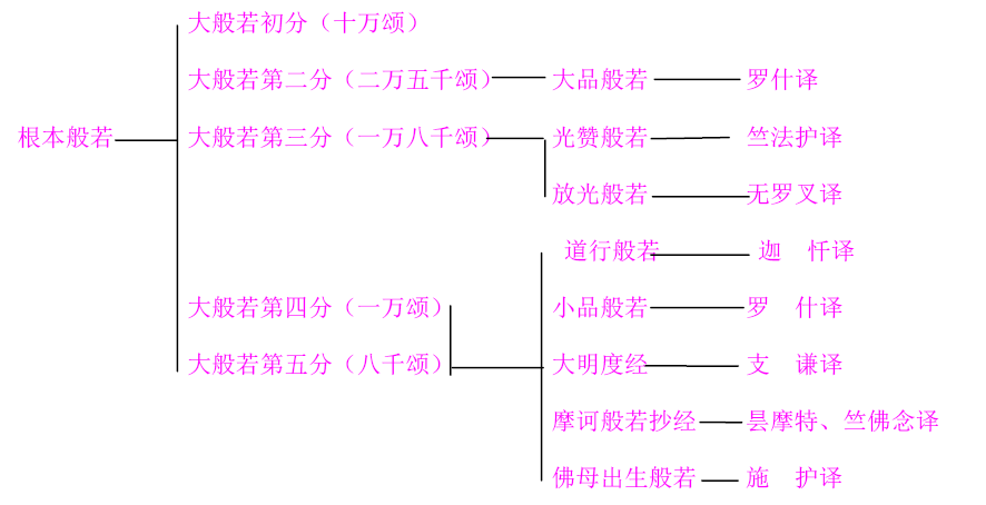 在龙树时代,所流行的般若是《小品般若》及《大品般若》;在中国,《小品般若》的初译是后汉支娄迦谶的《道行般若》,《大品般若》的初译是西晋竺法护的《光赞般若》;此两种《般若》的汉译,各有数种。现在根据龙山章真的《印度佛教史》第三篇第二章,将《小品般若》及《大品般若》在《大般若经》中的地位及其异译,列表如下: