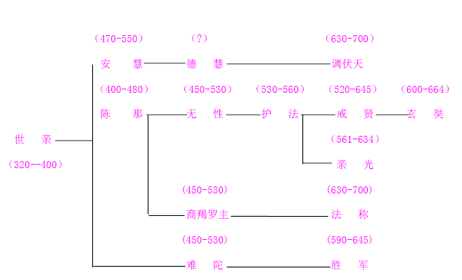 其中的陈那、安慧、德慧,是世亲的弟子(德慧又有人把他算作安慧系下)。难陀在世亲系下,因唱种子新薰说,异於古来的种子本有说,故别出一派。亲胜、火辨为世亲同时代人,火辨是一居家的隐士。胜友、最胜子、智月,皆为护法的弟子,大都出现於西元五六一至六三四年之间。