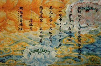 在阿弥陀佛光明的世界里,黑暗与恐怖消失了踪影,热恼化为清凉甘美的八功德水,苦痛绽放出微妙香洁的莲,怨恨和不满转成柔软的慈悲,天空中就落下了~ 缤纷适意的曼陀罗华。 阿弥陀佛太了解凡夫的我们,茫茫造业、受苦、受难,其中不得已的苦衷,他宽广温暖的心中,充满了无尽的原谅与包容,他柔软的兜罗棉手,经常的伸长著,抚摸我们的头,鼓励我们要面向光明。阿弥陀佛~ 就像一首甜蜜、甘美的曲子, 抚慰著每一个疼痛的伤口, 抚慰著每一颗受难的心灵,真正是佛恩浩瀚,难以言喻,阿弥陀佛....。。