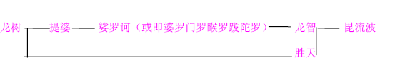 在印度佛教史上,无上瑜伽乃是最后发展成功的密教法门,而且其来历多不可考察。我们所能知道其根源的,只有从那烂陀寺座主胜天论师之门,出了一位毘流波,他向龙智学密而得悉地(Siddhi 是修三密相应而得成就妙果),他和龙树之间的传承关系是这样的: