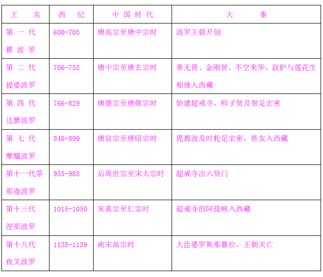 因此,到了波罗王朝的第十七代,罗摩波罗王时,无畏现护即成了印度密学的殿军。其后不久,第十八代夜叉波罗王时,大臣罗婆斯那篡位,波罗王朝即告 覆亡,继之以四代约八十年的斯那王朝。现将波罗王朝与佛教有关的大事年代,列表如下: