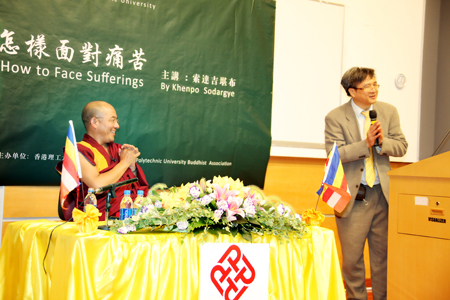 甘耀权会长(粤语):用什么话讲?他们喜欢听广东话。首先欢迎索达吉堪布来到香港理工大学讲座,更加感谢各位嘉宾,不论是我们学校的朋友,或是外面的朋友,如果没有你们,堪布也没办法讲法,所以你们很重要,要感谢大家。