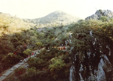 上山,上山,呼唤著「南无本师释迦牟尼佛’。牛儿与我们同行,四周的岗峦还是带露珠的气氛,为什么这一切如此熟悉?不觉得离乡千万里,却觉得此处是家乡。过了小桥拜上山,拜这既近又远、既远又近的佛菩萨。半山腰玄奘大师的茅屋虽然已经不在,而那一块块的石头却记载著当年他的风貌,好一个‘宁向西天一步死,不向东土一步生’的三藏大师。我手上的香只是小小的一支,那花环的颜色也不鲜艳,然而心中的香云却纷纷涌起、花儿也朵朵绽放。我们的解脱是佛菩萨的血泪啊!三千大千世界何处不是菩萨为我舍生命处,念此,念此;一拜、再拜,我的礼敬到达最深处。