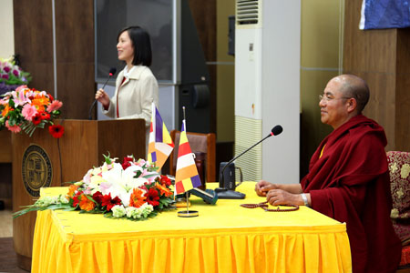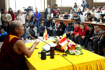 当然,今天的交流很自由开放,按照国际上的方式,我坐得最低,你们坐得很高,每个人都可以观察我,这样就不会觉得我高高在上,不管说得对不对都非要接受了。现在是21世纪了,无论是藏传佛教、汉传佛教,还是学术界的各位人士,都应以非常公正、客观的态度来分析问题,所以,倘若我在讲的过程中,语言上和内容上有什么毛病,等一会儿你们可以直接点出来。