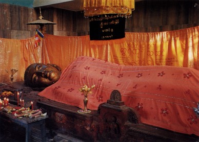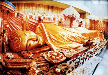我们沉重地走进堂内,这涅槃城的纪念堂中,赫然佛陀躺在那里,丈六的金身,绣著花的桃红色被,覆盖著他老人家,身旁供养庄严的幡盖。点燃蜡烛,燃起清香,佛子们随侍在侧,有的人已经忍不住哭泣。我看著他、绕著他、念著他,一圈又一圈,他的表情如此的奇妙,他的遗教是什么呢?当我们从足侧看他,他的眼睛是张著的,仿佛有一个大烦恼尚未解决,他的嘴角,仿佛还要演说,还在演说,说著「佛灭度后,以戒为师’,他的嘴角仿佛还在交代著地藏菩萨,以一种无尽的声音:‘勿令众生堕于恶道中一日一夜!’然而当我们绕到顶侧来看他,他的眼是闭著的,他的眉宇多么开阔!他的微笑多么慈祥又飘逸!仿佛一切都已经完成;仿佛苦难虽有,然而找不到受苦的人;仿佛应度者已度,未度者也已种下得度因缘,他平静地完成这一切。再看看他的嘴角,这微笑多么奇妙!仿佛说:‘我不得不走啊!你们这些撒娇依赖的孩子们,如果我不走,如果我不暂时引退,那么你们的膝盖臂膀永远不能茁壮,孩子们擦擦眼泪,我只是要你们成长......’太奇妙了,这种微妙的感觉。