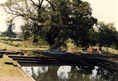 据说,车子是往北开,天气似乎愈来愈冷,愈来愈干燥,现在才知道,印度人包著头巾是有道理的,是必要的,这种干燥的飞沙,令人嘴唇裂开,甚至流鼻血,全团的人几乎都咳嗽,这是很难治的干咳嗽,后来去印度店买当地人用的药才见效,所有的人都不约而同,变成印度的装束打扮,绑头巾、围披风。我们目的地是蓝毗尼园,这是在尼泊尔境内,佛陀的诞生地,有人矫正我说,这不是佛陀的诞生地而是悉达多太子的诞生地,佛陀的诞生地是在菩提伽雅的金刚塔边金刚座,在那儿,悉达多太子成正觉才名为佛诞生。法师说:‘如果由加德满都坐车过来,风景更美,也不用再签证,由印度入尼泊尔边境,要过五关。’我们是好命的旅客,坐在车内看风景,一切繁杂的手续由华侨菩萨承担下来,颠颠簸簸、一关一关,由清晨四点出发,到圣地已经是中午了,望望小坡、望望菩提树下的平台、望望池水、望望四野,这儿当时有百花齐放、众鸟齐鸣,庆贺悉达多太子的降生,然而今日太子沐浴的水池,已是青苔弥罩,或许天人看它还是琉璃般的美好,然而末法的众生,只能由青绿的水来体会它的甘美,拾起一朵白色的菊花,沾沾池水洒在头上,和阿清在池边缅怀,有时候一念之间,在心中会闪现所有的美好。