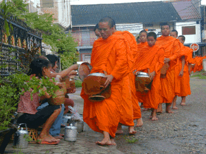 早上5点钟的时候敲钟,大家洗漱过后在竹佛殿里上早课,然后禅坐和吃早饭。之后分成几组去不同的寨子里托钵乞食。