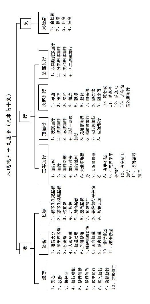 十三、无实性智次第加行[法无性自性渐次加行]:为了(三智之相)能获得稳固,而以证达一切万法真实本体无有差别的方式,次第修习三智之相的菩萨瑜伽,即是无实性智次第加行的法相。