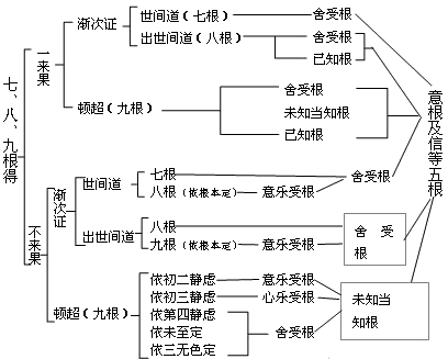 在见道、修道、无学道中必定会具足九种根,这九种根也称之为无漏三根,即于见道时,这九根称为未知当知根;修道时意识所在的九种根称之为已知根;在无学道时称之为具知根。