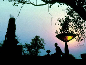就这样二人往复交谈,不觉已日落西山。太子回到寝宫见到自己的爱妻耶输陀罗,又被众多采女、种种娱乐而相围绕。和平日有些不同,五欲的刺激依旧撩拨着他的神经,可他的内心却越来越清醒,曼妙的音乐响起,鼓声渲染着动人的节奏,在那熟悉的场景之中,在欲望的生起与湮灭之中,他仿佛被抽提了出来,他看见了心念被欲望所勾牵,也看见了欲望被满足的喘息,他看见了那一切美丽故事背后的简单动机,更看见了这动机的虚幻和人的迷惑。恍惚之中,他仿佛听见了遥远的呼唤,那么遥远而又如此真切,穿透一切世间的沉溺,穿透一切吠陀诸天的掌握,穿透一切虚伪的麻木的无聊的劝说,他生起了一种不可遏抑的向往——一切都无可挽留了。