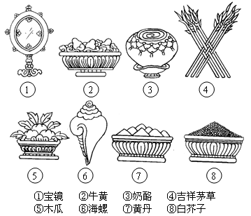 八瑞物:昔日,色界天女持光母供养世尊明镜,佛将它加持成吉祥物。同样,自己也可供养清澈、明亮的白银镜,愿自他一切众生证悟正法实义。依此类推,如村姑妙生女供养世尊奶酪,自己也可供养奶酪,依此愿获得禅定食;如护地大象之子供养牛黄一样,自己也供养牛黄,依此愿遣除烦恼疾病;如卖草童子供养吉祥草一样,自己也供养吉祥草,依此愿获得无有生死衰老之身;如木天女供养木瓜一样,自己也供养木瓜,依此愿逆次清净十二缘起而获得涅槃果位;如帝释天王供养右旋海螺一样,自己也供养海螺,依此愿能发出法语妙音;如星王婆罗门供养黄丹一样,自己也供养黄丹,依此愿慑服三界;如金刚手供养白芥子一样,自己也供养白芥子,依此愿圆满殊胜能力。就这样来意幻供养。如果供养明镜,则可获得善妙色相、聪明智慧等相应其因的果报(,其他都可依此类推)。