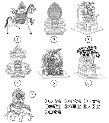 轮王七宝:金轮宝:昔日,转轮王们在皇宫顶层说谛实语后,以其福德力金轮从东方虚空中降落到国王面前,依此可以随心所欲周游各处,以金轮宝引导行进的同时,其余轮宝也随之而至;神珠宝:颜色碧蓝,毫无瑕疵,所放出的光芒可照亮八十由旬的范围,以此能力遣除四大洲一切众生的贫穷,如意满足一切所愿等具有许多功德;玉女宝:相貌端庄,令人见而生喜,远离女人的一切过患,具足功德,天生具有悦意的妙香、所触等;大臣宝:财富受用犹如多闻天子一样圆满,假设国王下令使三千大千世界遍满黄金,那么他一刹那间便可办到,并且具有慷慨博施的福报;白象宝:具有六颗灰白牙齿及红色顶髻,身体高大,覆盖宝珠璎珞,具有一千头普通大象的力量,神速无比,诸如护地大象之子;骏马宝:身色湛蓝犹如孔雀颈羽般让人赏心悦目,无有疾患,嘶叫声传遍整个南赡部洲,知道国王心中所想,因此称为骏马,一日内可转绕南赡部洲三次,迅疾如风,诸如巴拉哈马王(从罗刹洲引导众生的马王,是观音菩萨的化身之一);将军宝:具有坚韧毅力,极为擅长技艺,并具有作战的善巧方便,随行有四大军队,仅以挽弓便令对方所有敌军胆战心惊、望而却步,威风凛凛、势不可挡,诸如帕吉波国王。