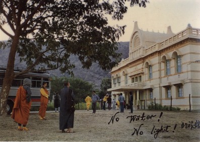 ‘请问是路坏还是车坏啊?’如此颠簸震得大家大笑,谁如果有结石一定给震落了,不知道是谁苦心设计了这波浪形艺术的路。印度的平原石丘在车窗外掠过,牛羊、茅屋、帐篷一切都熟悉。大约下午五点半,夕照中我们抵达了离灵鹫山只有十分钟车程的旅馆,这不知名的旅馆外形倒是十分派头,但是一问之下,他们竟堂皇简洁的说:‘没有水!’‘没有灯!’‘一张床,七个卢比,睡两个人而且没有棉被。’‘喔!’我不禁笑起来‘没有水又没有电,那就可以不用洗澡了。’这一种脏孩子高兴的声调,惹得林、刘两位居士都伸出食指,指著我相视而笑。(卢比是印币单位)