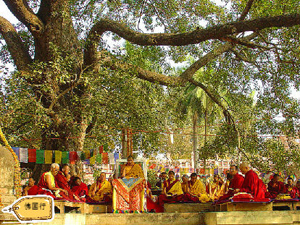 大塔之西就是菩提树了。数千年岁月,几度枯荣,几度转植,而今依旧枝繁叶茂,四时不凋,一如既往忠实的护佑着金刚座。偶尔飘零的落叶很快就会被有心者收集起来,作为纪念。近来菩提树和金刚座已经被金属栏杆围起,朝圣团供养的帷帐将其团团围起,每日里只有短暂的时间对人开放,届时人们排队进入,在金刚座前礼敬供养。对无上正等正觉的虔敬和向往是佛子内心最为根本的一种力量,前额轻触宝座的瞬间,就会和千百年来的朝圣者融为一体。一千三百多年前,玄奘大师历尽艰辛终于来到菩提树下,他五体投地,悲泪盈目,慨叹自己在佛世时不知在六道轮回中的何处漂流,直到像法时代才来到此圣地。当时正逢远近数千僧众夏安居结束来此,看到菩提树下这位泪流满面的异方僧侣,一时悲情所感,数千人无不垂泪鸣噎。曾经一度被尘土掩埋的金刚座如今装饰得华贵庄严,宝座上盖白色布垫,金色棚顶覆玻璃珠帘,宝座上堆满了鲜花和来自世界各地的供养品,从这美好的景象中可以清晰的感受到,世尊悟道时为这个世界所带来的欢喜与祥和、光明与希望遍及四海,泽被众生数千载而绵延至今。那是怎样的一个时刻呢?……
