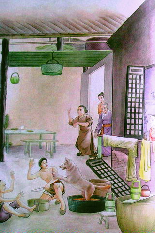 有一天,将狗浸在盆里,正要分割时。狗突然从盆中跃出盆面约一尺多高,对准曹升元的颈部,狠狠地咬了一口,鲜血淋漓,曹痛得几将晕倒过去。