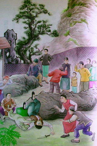 清乾末年春天,将近黄昏时,又宰杀一狗,放入大缸,用热水浸湿拔毛时,狗忽然凶猛地直立而起。狠狠地咬住蔡六的手臂不放,蔡六疼痛难忍,仆倒在地,呼号惨叫不止,在旁的人见状,用木棒击狗,可是狗齿坚利,犹如金属铸成,无法松开,直到蔡六断气,狗才罢休。