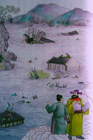 水灾前五天夜间,有渔夫见黑衣官司吏,向江中捡取一本黑册,渔夫询问原故,黑衣吏说:“这是杀生的报应,应从速戒杀放生。”说罢,又将黑册投入江中,顷刻就不见了。
