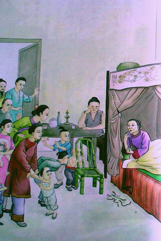 有一天,老妇人身染重病,自己将草索一束一束吞入腹中,吞纳完毕,又将草索一节一节抽出,抽完又纳,纳完又抽,肠肺间的血水和粘液,一一从口中牵出,并自言自语说:“我接受我儿孽钱供养,因而受此恶报。”老妇人若不抽纳,反而觉得难受,邻里村人,前来围观,都惊骇感叹,如此折磨了数天才死。