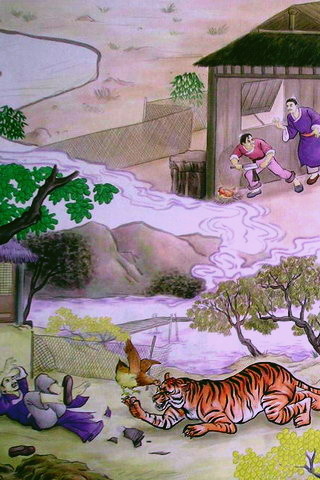 后来,里胥再来时,见母鸡率一群小鸡,向前踊跃欢舞,好象表示感恩的情状。里胥办妥事情回去时,行走百步,途遇老虎出来,正在惊慌恐惧时,忽见母鸡飞来猛扑虎眼,里胥因而逃脱,免遭虎难。