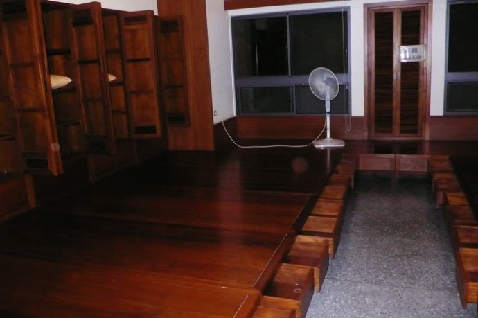进入禅堂,我们在斋堂首次见到了禅堂堂主果元法师,法师看起来沉稳而温和,话不多。首先由果晖法师给我们简单介绍了一下规矩,比如禅修期间除非特殊情况否则不准外出,二十四小时禁语,不准看书、记笔记,也不准照相,在斋堂用斋时用固定的碗筷,每个人都发两块小毛巾用来擦碗用,每次过堂后自己用开水冲刷过碗筷后喝掉,然后用毛巾擦干净自己的碗筷。接着我们到二楼的寮房,将自己的被子、衣物等放到寮房,然后绕过三楼的禅堂到四楼的小参室,等着果元法师给我们介绍禅修的基本方法。三楼的禅堂中佛教学院的学生正在听主七法师给大众答疑。