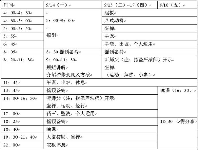 因为是佛教学院的学生参加的禅修,所以安排上也没有那么严格,日程安排的相对比较轻松: