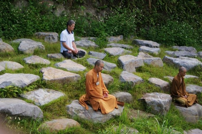 因为佛教学院的学生平时的功课就比较紧张,所以禅五期间并没有采用非常严格的方式,而是随顺大家的适应情况,中间如果打坐腿太痛的话可以起来到旁边拜佛或者到外面廊道中经行,而且在一些时候还可以带着自己打坐的垫子到旁边廊道靠近通风的地方去打坐,这样可以缓解气温太热而导致的不适应。我们去的期间,台北的气温还相当的高,在禅堂打坐的时候,白天常常是汗流浃背,幸好禅堂寮房的洗浴条件很好,不然还真不容易适应。最后一天的上午天气比较好,我们还到禅堂户外,靠近溪边打坐,体验一下观世音菩萨“耳根圆通”的修行方式,后来又随着大众绕户外的树林经行。这片地方是法鼓山专门为禅修者设计提供的,独立于外面,游客进入不了,有树林、草地、溪水,还可以沿着溪边的小路缓缓走到背后的山坡上,非常适合禅修中间到户外经行。