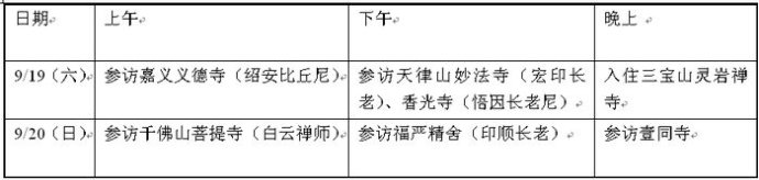 2009年9月19日,是一个周六,我们早起和法鼓佛教学院学士班及硕士班的学生们一起出发,赶往台湾南部嘉义地区去参访。因为昨晚惠敏法师在禅五结束时给大家有所嘱托,佛教学院的同学们都按照要求早早地到集合地点等候。我们大陆参学者被安排和硕士班一二年级的同学一辆车,惠敏法师同行。