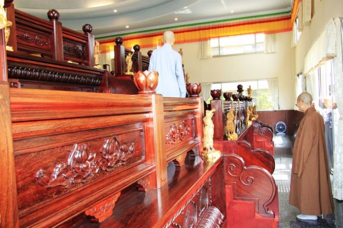 法鼓山在台北的金山地区,相对于台湾靠近北部,而嘉义地区在南部,所以路上需要花不少的时间。我们在上午大概十一点多钟才抵达第一站——嘉义的义德寺,与原计划相比晚了一部分时间。义德寺的法师们早早到门口迎候,看着她们如此盛情迎接,让自己感到很惭愧,要不是惠敏法师带队和佛教学院集体的感召,我们大概是没有这个福报的。义德寺是一座尼众道场,以学律持戒为核心,和尚尼是绍安比丘尼。我们依次排班,进入大殿礼佛,简单在斋堂用过午斋后,跟着绍安法师和前面做向导的比丘尼参观义德道场。