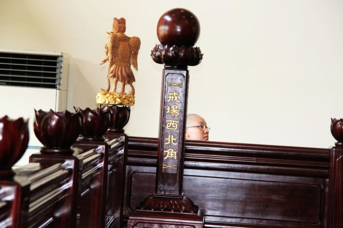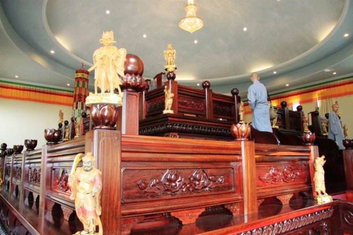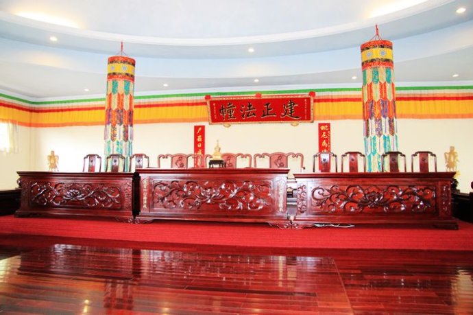 参访过义德寺,我们在下午的时间来到天律山妙法寺。妙法寺是这次校外教学主要的支持发起和组织者。寺院不大,掩映在茫茫树林中,通向寺院的路也很窄,以至于我们的大型旅游车很艰难地慢慢开到寺门口。寺院外观也没有砖雕镂刻的华丽,却有点像普通的厂房一样简陋,让人初一见很怀疑是不是走错了地方。进到里面才发现布置得非常庄严,虽然简陋却并不失庄重。我们依次进入大殿后坐定,看到前面一排贵宾席上有宏印长老、妙法寺开山长老天常法师、妙法寺当家天宏法师、妙法寺住持天明法师。宏印长老在这里给大家开示了有关弘扬汉传佛教的话题。宏印长老是台湾高雄人,一九四八年生,十七岁出家于台北树林镇吉祥寺续祥长老座下,亲近印顺导师六年;先后历任六所佛学院讲师。曾任圆光佛学院教务长六年,嘉义宝华佛学院院长三年。台湾佛教青年会第一、第二届理事长。现任财团法人佛教青年文教基金会董事长、海印精舍及自在讲堂住持。听说他对印顺导师推崇之至,故而改名叫“宏印”,表示专宏印顺导师思想的意思。在妙法寺的大殿,他给大众说: