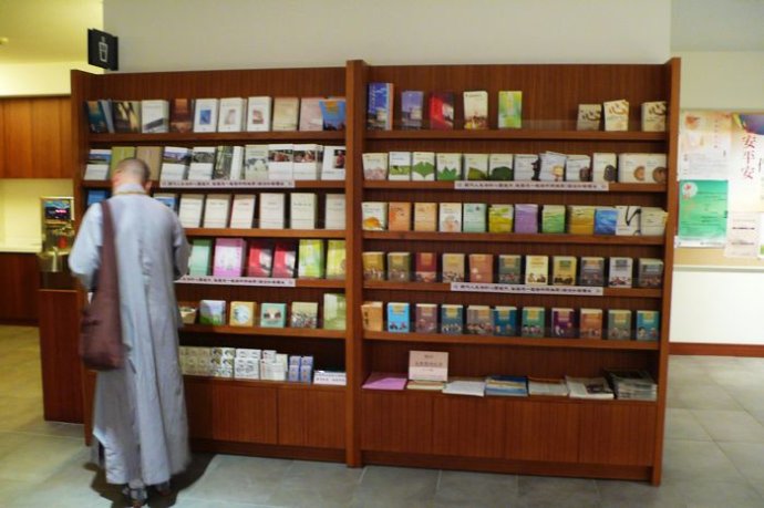 贤生法师说:“上午下课后,我和贤世法师去‘行愿馆’看了看,那是信众接待处。法鼓山对信众的引导很细致,有一套系统。客堂、义工报到、流通处、文教展览等都集中一块儿。客堂有两处。义工有专门的培训。来的人,不管是新人、旧人,想做义工、或作供养、或参观,都有专门的引导人员。那里的结缘品和流通的书都是法鼓山自己出的,琳琅满目。流通的书接引老年人、中年人、轻年人,以至到给小孩看的卡通书都有,而且很多种结缘的小册子可以放在口袋里,很人性化。那里不让照相。今天只是粗略看了看,后面再找机会深入地去参学。”