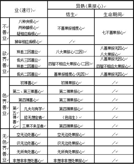 这里所说的“善心”是指进入无色定的心,在心路中称为“禅那速行心”。对于凡夫和有学圣者而言,速行心非不善即是善,入禅的心是善心,善心中的思心所负责造业,所造的业即是无色界善业。无色界善业的成熟可以带来投生到相应无色界天的果报。同时,无色界梵天人的结生心和他们所投生之处相应,例如有一百个成就识无边处定者投生到识无边处天,他们的结生心都一样——识无边处果报心。