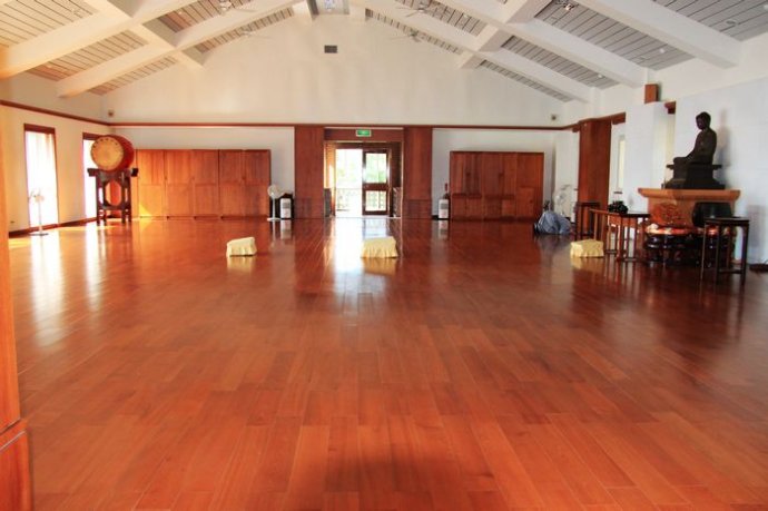 法鼓山早上是4:10打板的,每间宿舍都有一个小音箱,所以板声听的比较清楚。起床后,我们稍作洗漱和休息,4:40分到男寮一楼处去做“八式动禅”。法鼓山的禅法有自己的特色,参考和融合了其他佛教弘传地区的禅法的特点,“八式动禅”就是一个明显的例子。圣严法师在《雪中足迹——圣严法师自传》中说:“我的方法与中国禅堂中用的不一样。中国禅堂除了在每柱香的禅坐之间,加入‘快步经行’(走路时的一种禅修法)外,没有别的运动,在我的禅修教法中,除了快步经行外,还融合了南传的‘慢步经行’。我也运用了印度瑜伽及中国的太极拳与按摩。”这个“八式动禅”融合了很多瑜伽等的动作,将早上刚起床后的身体舒展开来,从中让心慢慢宁静,准备早上的禅修。接着进入禅堂进行晨起的禅坐,在禅坐前先有一个集体的简单的忏悔仪轨,仪轨是: