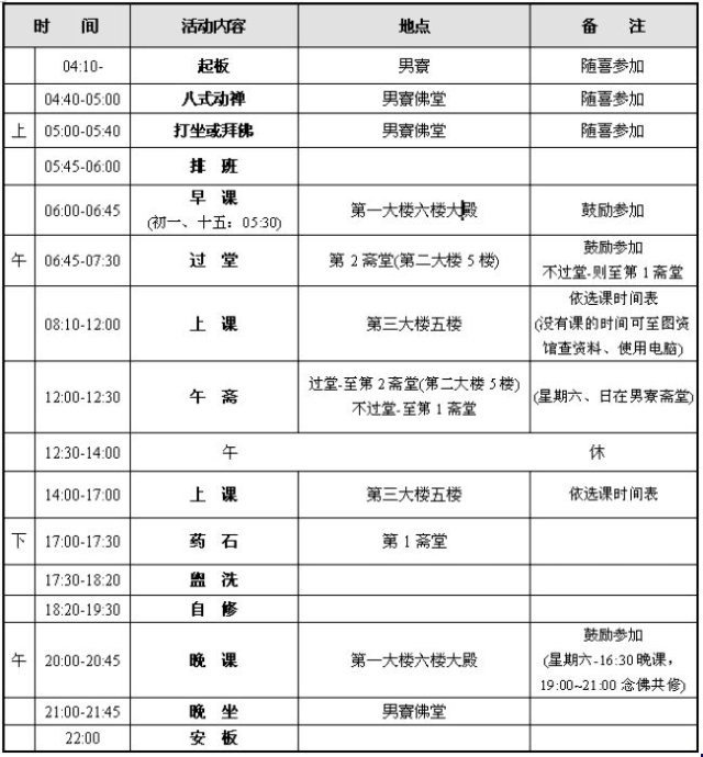 下午从两点开始上课,一般上两到三节课时间。下课后可以用药石或者自由安排。药石后可能会上课或者自修,僧大的学生这时候要写自己一天的自治录,很像龙泉寺的反省日记。接着晚上八点钟上晚课,晚课过后又是禅坐时间,到禅坐结束时,一天就结束了,晚上十点钟安板休息。