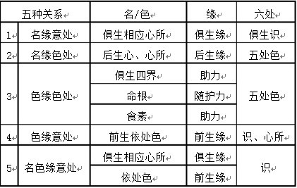 “名色缘六处”可说是在十二支缘起中最复杂的,一共有五种关系: