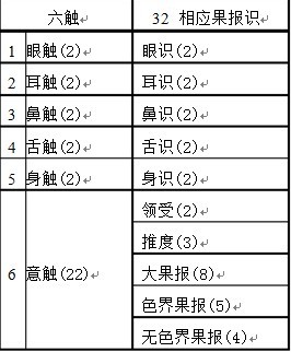 眼识有善果报和不善果报两种,这两种眼识里都有触心所,所以有两种眼触。耳触、鼻触、舌触、身触也是同样。意触(manosamphassa)也是世间果报心里的触心所,一共有22 种,分别是:善和不善果报领受心 2 种;善和不善果报推度心 3 种;8 大果报心;5 色界果报心;4 无色界果报心。所以,与双五识相应的 10 种触,加上 22 种意触,共有 32触,和前面“行缘识”所说的 32 种世间果报识一样。