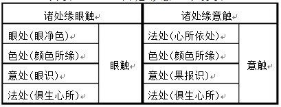 这里先以眼触(cakkhusamphassa)为例来说明“六处缘触”。在六处中,眼处是指眼净色,属于内六处;色处是指颜色所缘,属于外六处;在眼识名聚里,眼识一心属于意处;剩下七个心所,扣除触心所后,还有六个相应心所,即:受、想、思、一境性、命根和作意,它们属于法处。对于在眼识名聚里的触心所,它必须缘于六处中的眼处、色处、意处和法处,才会有此眼触的产生。