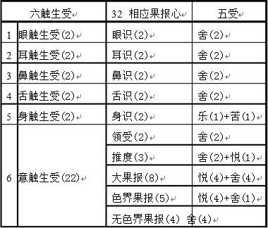 意触生受有 22 种(32 果报心减去 10 双五识) 分别是:2 领受心,舍受;3 推度心,2 个舍受和 1 个悦受;8 大果报心,4 个悦受和 4 个舍受;5 色界果报心,有 4 个是悦受,第五禅果报心是舍受;4 无色界果报心,都是舍受。