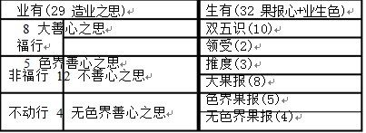 生命其实是由色、受、想、行、识五蕴构成的。五蕴又可归纳为色法与名法。色蕴是色法,受、想、行、识四蕴是名法。色法有四因——业生色(果报色蕴)、心生色、时节生色和食生色。名法又可分为心法和心所法。其中,识蕴是心法,受、想、行三蕴是心所法。名法依本性分为四类:不善心、善心、果报心、唯作心。作为果报的名色法,也就是业生色和果报名法都是有因的,它们的因就是过去生所造作的业。
