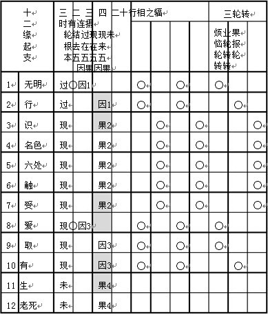 由于有了过去五因,才会带来今生五果,过去的无明等五法和现在的结生识等五法是因果的关系。由于有了现在五因,才会带来未来五果,现在的无明等五法又和未来的结生识等五法构成一种因果关系。