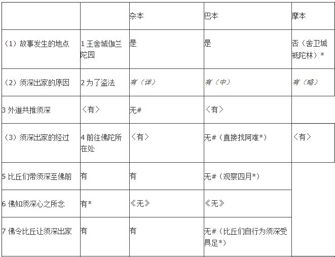 摩本前半段与杂本的前半段叙述较接近:须深到只陀精舍,见比丘们在「经行、禅坐」,并表明出家意愿。但接着,那些比丘表示外道要在佛教出家,「当试之四越,四越过已,得诸比丘意者,当与出家。」54 四个月後,那些比丘就自行帮须深出家,受具足戒,并未谘询佛陀的意见。