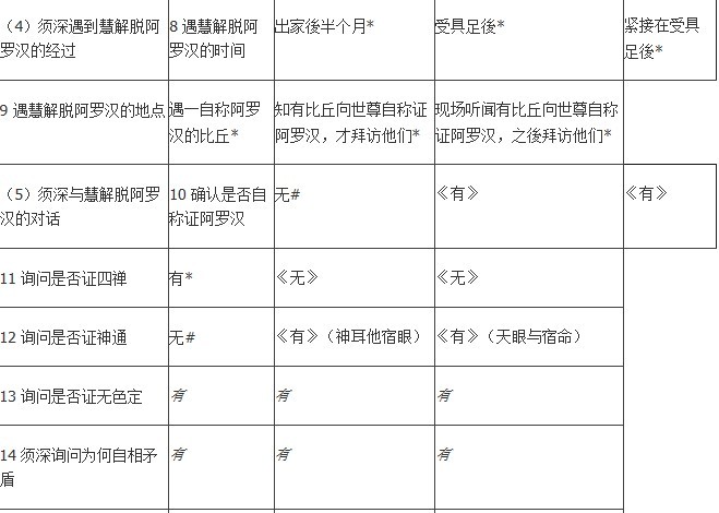 摩、巴二本中,须深在拜访他们之时,即询问是否他们在佛面前自称已证阿罗汉。比丘们回答「是」。之後,摩本只说:须深依次询问他们是否已得天眼、宿命智、无色解脱。巴本则较摩本详细,依次询问比丘们是否得证神足、天耳、他心、宿命、天眼通及无色解脱。在摩、巴、杂本中,针对这些问题,慧解脱阿罗汉们都回答「未得」。须深也接着问道:为何自记说〔得阿罗汉〕,但又说未证此等诸法(只是三本用语不同)55 ?三本同样回答:自己是慧解脱56 。在此之後,摩、巴二本与杂本不同,提到:须深说不了解比丘们的略说,请比丘们广说。比丘们对此问题的回答在摩、巴二本中中并不完全相同。在巴本中,比丘们回答:不论须深了解不了解,他们还是慧解脱;至於摩本的回答大意则是:「虽然你不了解,但我们自己了解所谓的慧解脱人」。57