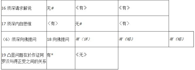 33),数量之多,显示巴、摩二本在三本中,是较为接近的传本。在这九项之中,有四项(10、 11、12 、16)是集中在须深与慧解脱阿罗汉的对话过程(即第五部分),在细分为八项的该第五部分中,占了一半之强。这也显出杂本在这部分是较为独特的,尤其杂本在第11 向指明慧解脱阿罗汉未证得任何禅那,但巴、摩本只提到慧解脱阿罗汉未证无色定与神通而未提到未证禅那74 。第11 与19 向代表有部对《须深经》所传达的法义之独特立场,明确表示:禅那并非证阿罗汉的先决条件。此外,杂本独有的第33 向,将须深视为漏尽者,则大大提升须深在证果上的地位。