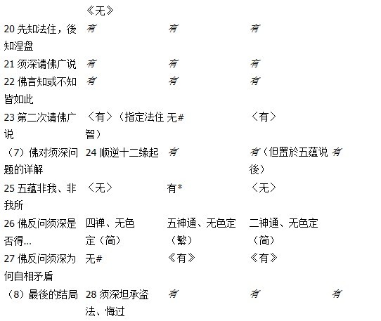 佛对须深问题的详解,以杂、摩二本较为相近,巴本因多了五蕴非我说,并详细重覆上述的「五神通」、「四无色定」而自成一格。
