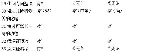三十三项中,三本一致者如前所述,又十四项;至於唯巴、摩二本一致者,有九项(6、10、11、12、16、19、27、29、33),这九项也是杂本独异(6、11、19、29、33)或独缺(10、12、16、27)的项目;唯杂、摩二本一致者,有五项(3、4、17、23、25),这五项也是巴本独异(25)或独缺(3、4、17、23)的项目;唯杂、巴二本一致者,只有三项(1、5、7),这也是摩本独异(1)或独缺(5、7)的项目。比对的结果显示:大抵而言,在内容上摩本比杂本更接近巴本;同时摩本也比巴本更接近杂本。同属上座部系所传的杂、巴二本,彼此的内容反而较不接近。