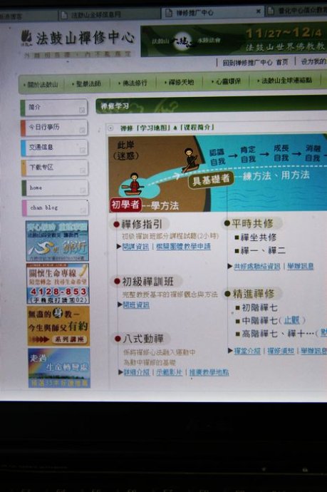 对“禅修中心”的介绍,只给出了网址(http://chan.ddm.org.tw/)和“禅修‘学习地图’&‘课程简介’”的页面,从页面图可以知道有:禅修指引、初级禅训班、八式动禅、平时共修、精进禅修等,进入网站进一步了解: