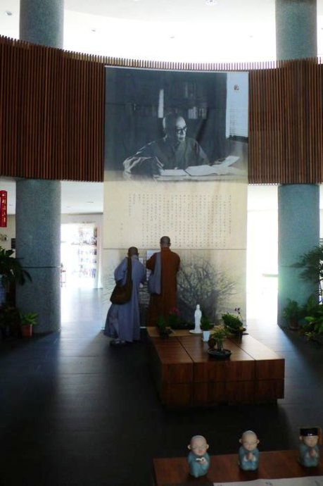 在圣严法师专区是个圆厅,正面是一张圣严法师阅经的大幅黑白照片,下面是他写给佛研所弟子和教职人员的一封感人肺腑的信,内容如下: