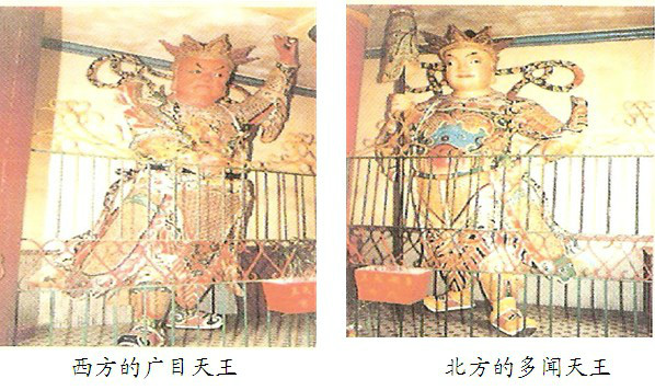 (2)四天王——又名四大金刚,分立在弥勒菩萨的两旁,他们都是护法神,护持东南西北大部洲(四大天下)。