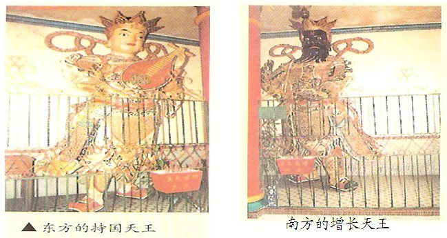 东面的一尊守护东胜神洲,身白,梵文音译(多罗吒),手执琵琶,是持国天王,护持国泰民安。