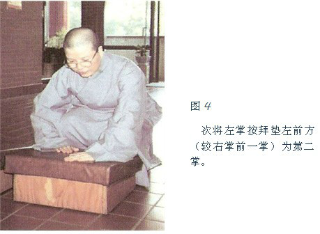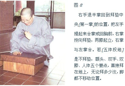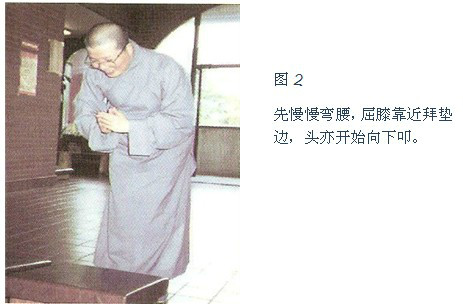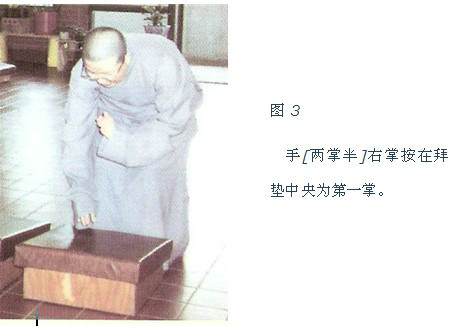 在大殿礼佛,要注意在甚么地方拜才恰当。大殿正中有主垫,那是专供住持大和尚拜佛用的,大家千万不能在这个拜垫拜。主垫后通常有三个拜垫,是做法事时,供斋主用的。通常可以在东单或西单拜。拜佛只要心诚,在哪里拜也一样,不这一定要行到最前或正中央拜。若非集体法会,最好随地而拜(所谓五体投地,以后会讲到)。此外,若有人在拜佛时,切勿在他前面横过,既打扰他人礼佛,也是对佛不恭敬。